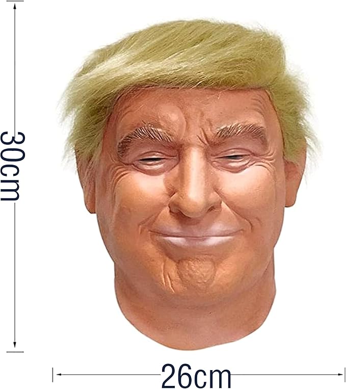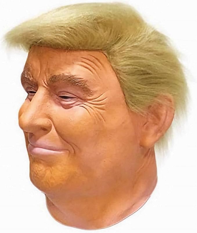 This iconic mask features a striking orange hairdo and a classic red tie, capturing the essence of a certain presidential candidate without ever mentioning his name.