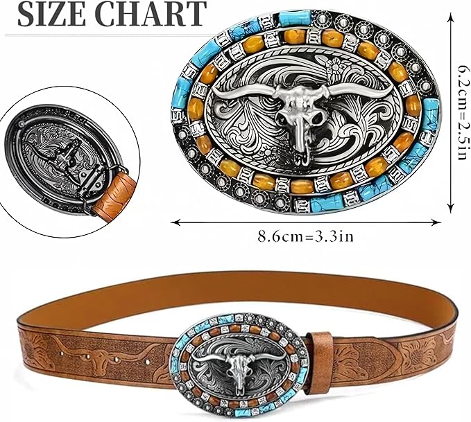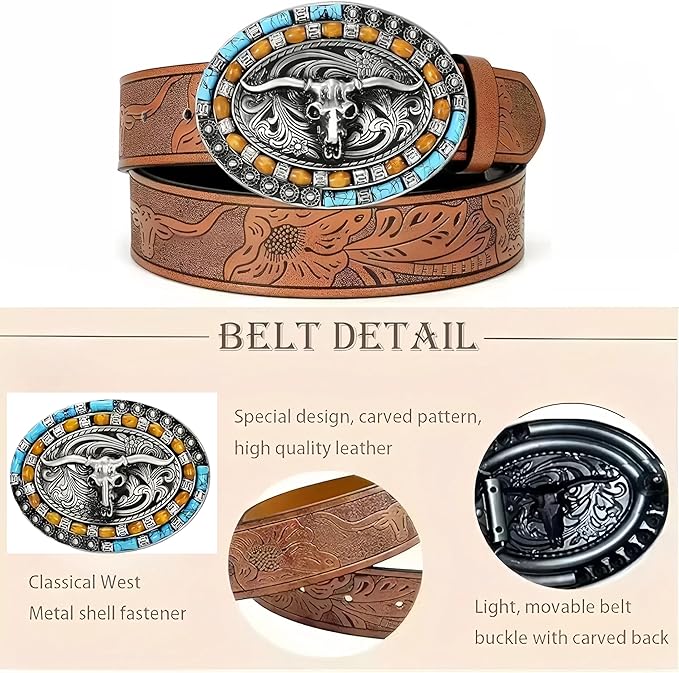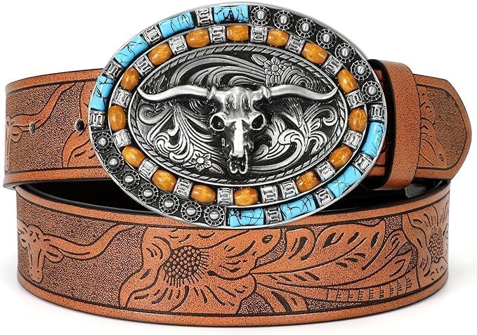 BELTS: Western Belts for Men and Women- Cowboy Belts Longhorn Bull Floral Engraved Pattern Buckle – MULTI BROWN
