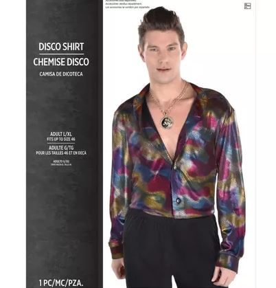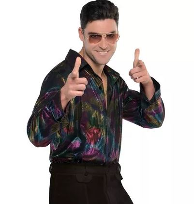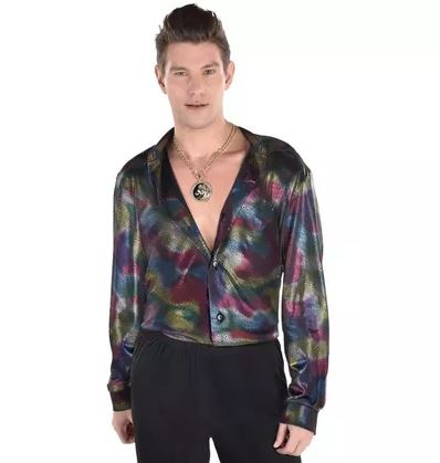 Transform into the life of the party with our Adult Disco Button-Up Shirt! Decked out in a kaleidoscope of vibrant, shimmering colors, this shirt is your ticket to the best 70s-themed parties. It’s all about peace, love, and dance moves!