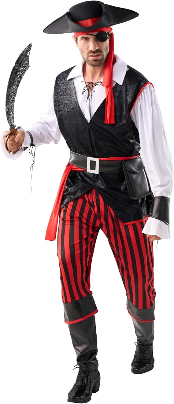 Super Value Pack for Mens 7 Seas Captain Cutthroat Pirate Role Play and Party Supplies. Excellent for Halloween Costumes Dress Up Parties, Medieval Captain Skullduggery, Costume Adult, Red and Black Pirate Accessories, Rum Pirate Costume, Ahoy Matey Pirate costume, Theme Party, Pillaging Ghost Pirate costume, Best Caribbean Pirate Costume.