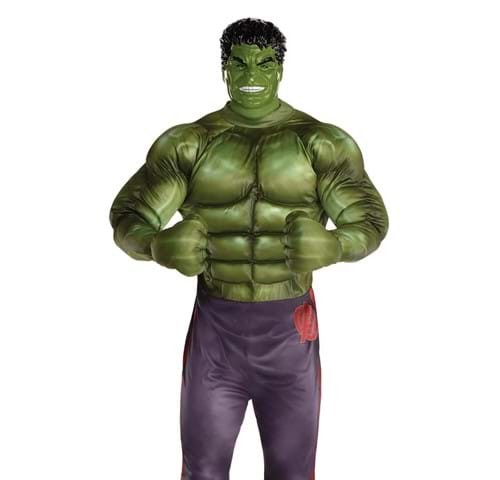 Jumpsuit has hook and loop fasteners down center back, fiber filling in the chest for muscular look