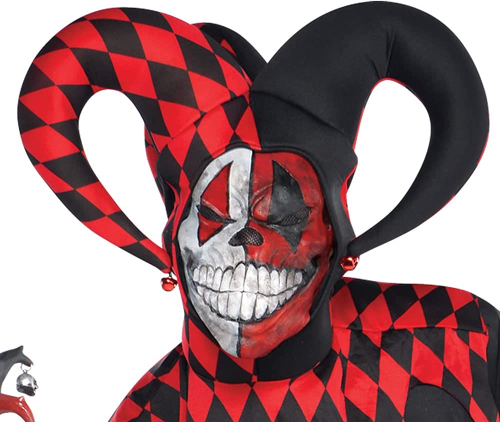 PACKAGE INCLUDES: 1 jester shirt, 1 headpiece, 1 mask, 1 pair of gloves, 1 pants – standard size