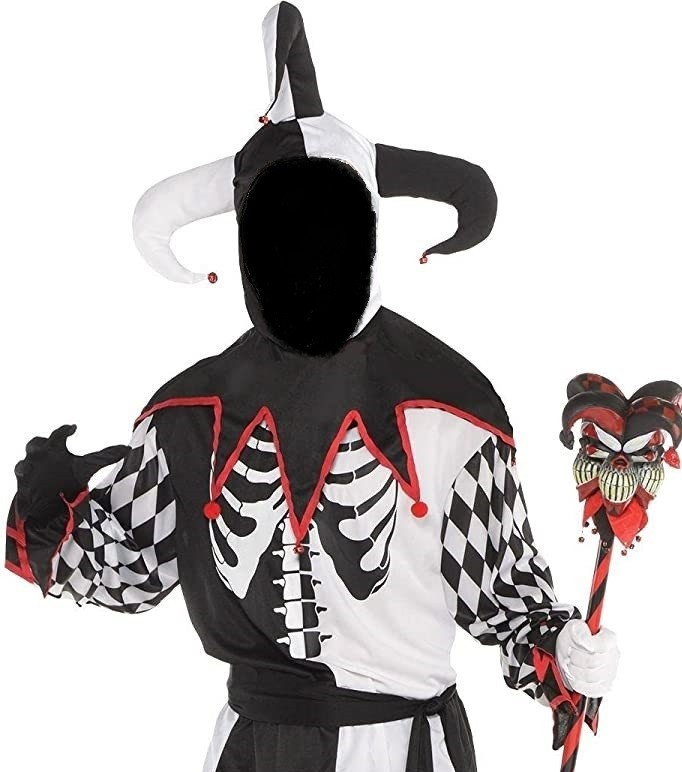 INTRICATE DESIGN: Features a jacket and pants with a black and white diamond checkered pattern design, and comes with a black belt, a sinister mask, and a jester headpiece