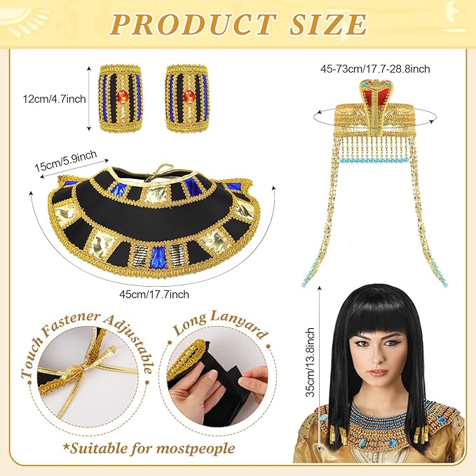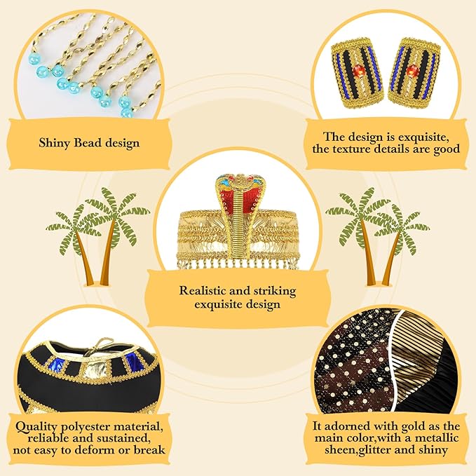 Cleopatra costume accessories are designed with Egyptian themed elements, the exquisite golden headpiece is decorated with cobra, turquoise rhinestone and gold beads; The Cleopatra wig with braids comes with gold metallic ties.