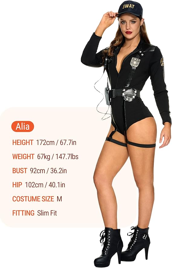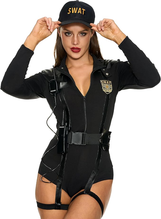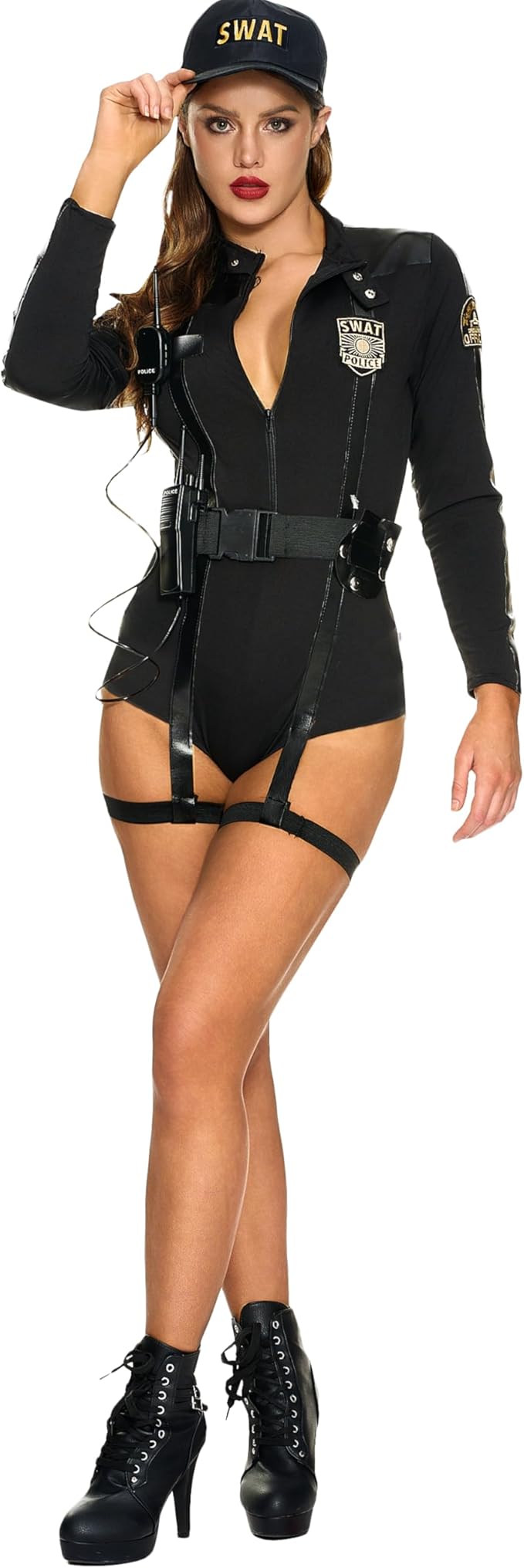 Set Includes: This swat team costume for women Super Durable and made with Higher Quality. Enhanced stitching at seams prevents tears.Our police costume bodysuit for women Includes bodysuit, hat, belt, walkie-talkie. Become the party’s center of attention with these police costume !