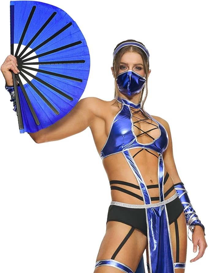 Set Includes: Woman ninja costume includes, 1 Headband, 1 Top, 1 Skirt, 1 Mask, 1 Pair of Cuffs, 1 Pair of Shoe , 1 Pair of Hand Fans. Covers for a complete Blue Ninja look.