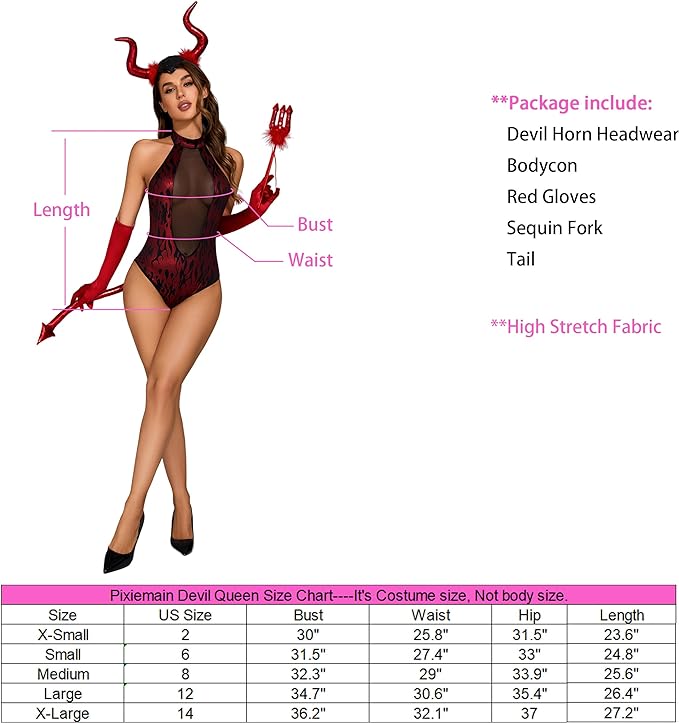 Includes: The adult women’s sexy devil costume includes a demon horn headband, bodysuit with mesh on front and attached a tail, red gloves, devil’s fork. You will not have to buy accessories separately as everything is already included in this kit.