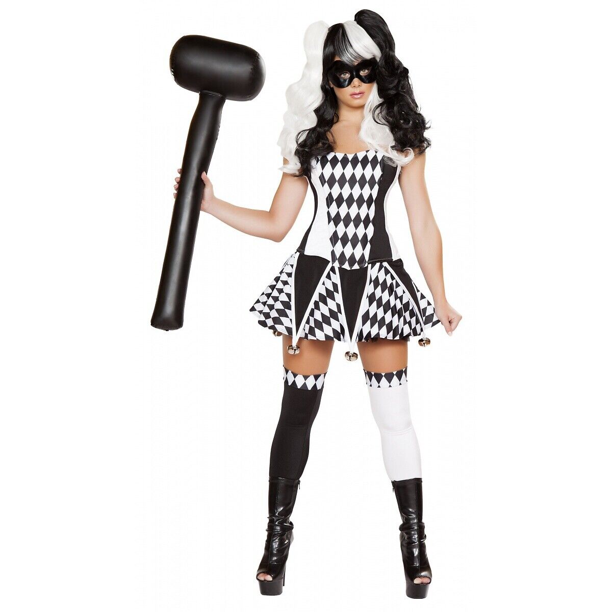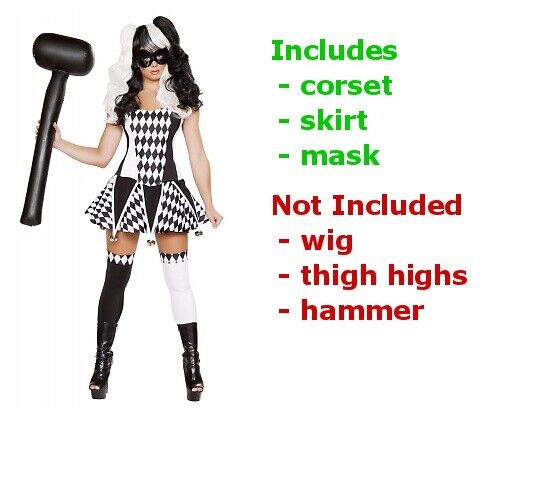 The black and white wig, jester thigh highs and inflatable mallet are not included with the sexy jester Halloween costume.