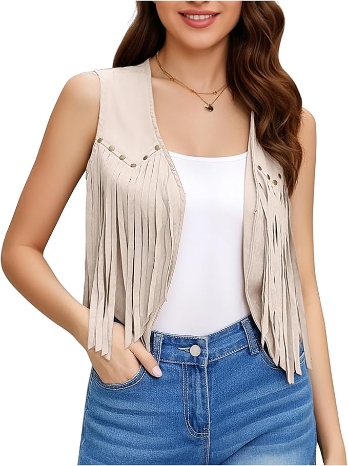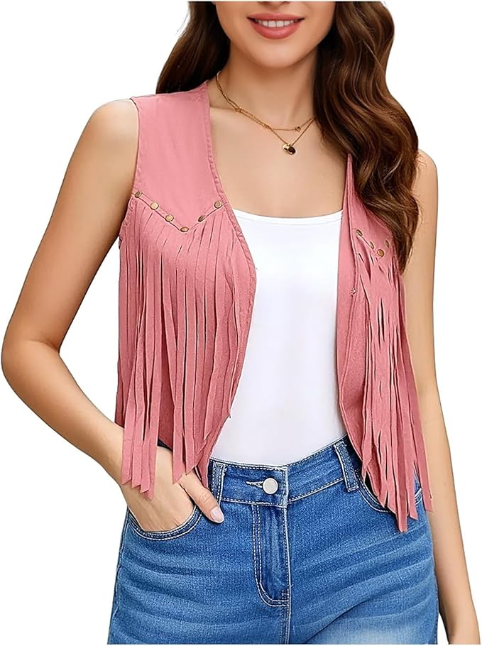 WESTERN – Women’s Short Tassel Vest 70s Hippie Faux Suede Sleeveless Fringe Jacket Western