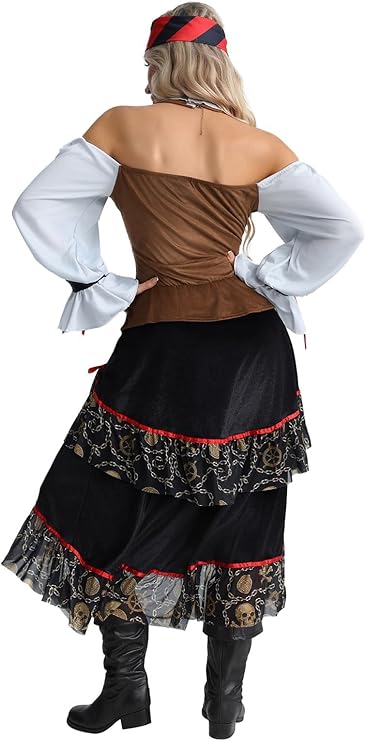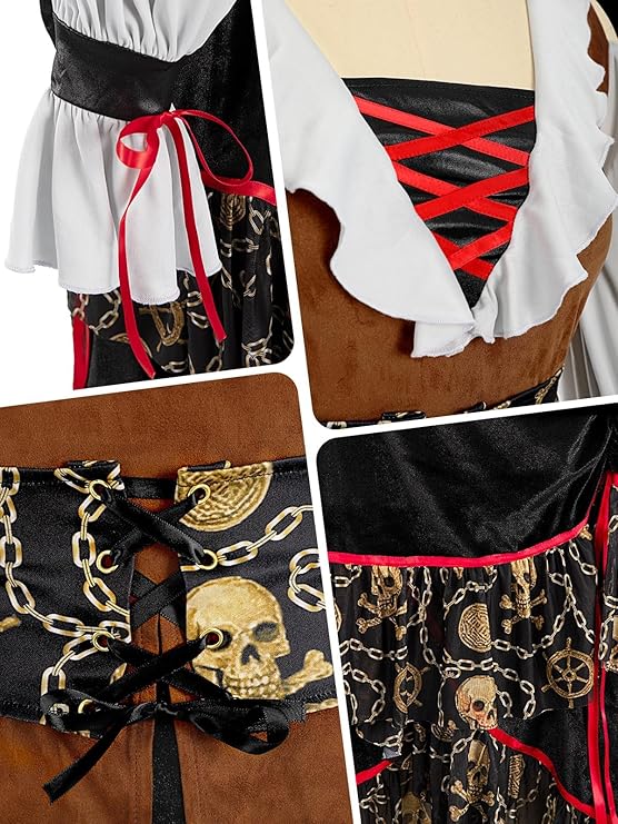 š“āļø Classic Pirate Style ā Off-shoulder design with white ruffled sleeves, faux leather bodice, and layered black skirt trimmed with red accents for an authentic pirate look
