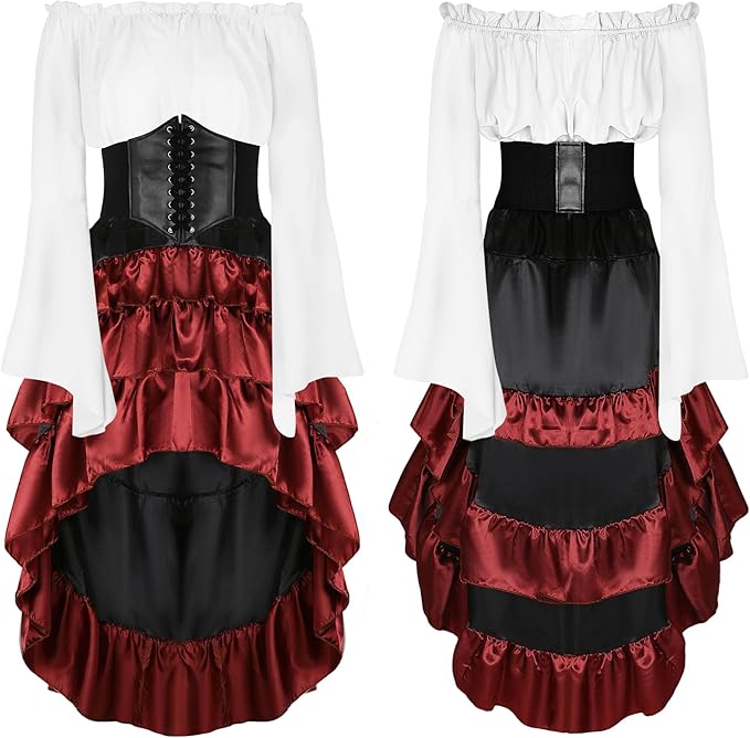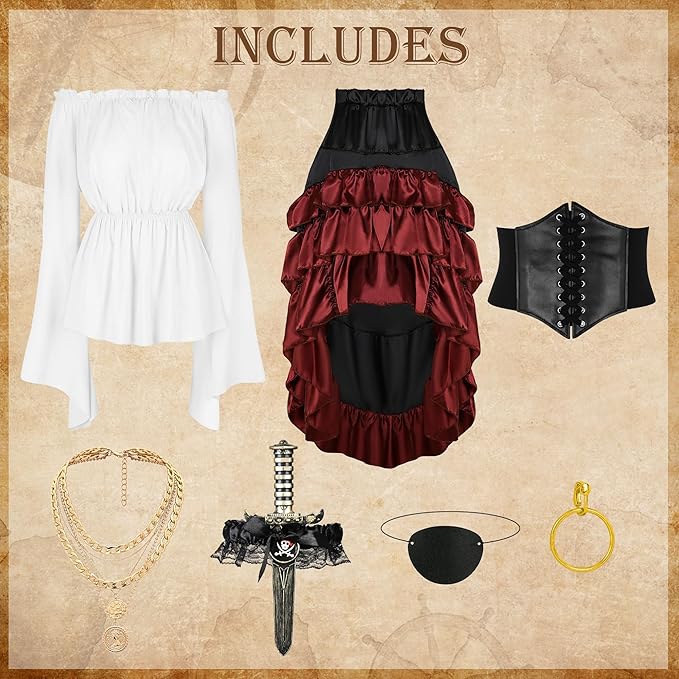 Package Includes: you will receive 1 set of pirate costume women, including 1 piece of renaissance blouse top, 1 piece of tied corset waist belt, 1 piece of Steampunk Skirt, and 1 piece of Necklace A Pirate Sword with Lace Bo, which will meet your need of taking a party or cosplay.
