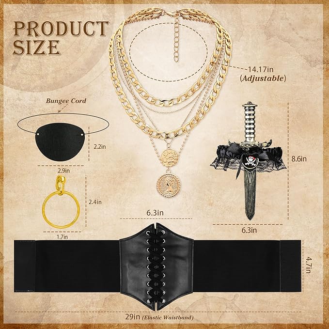 Pirate Accessories – Metal gold colored hoop earrings can clip onto any ear without pain, the necklace and pirate eye patches are good role-playing accessories, make your costume look like the real deal.