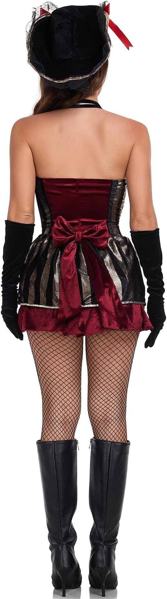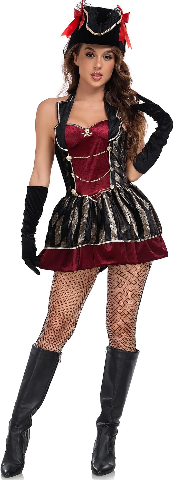 Women’s pirate costume includes top, skirt, hat and corset belt; Flared long sleeves and high-low ruffled hemline add glamor and attention to your outfit and create lasting memories, sure to make you stand out at the party.