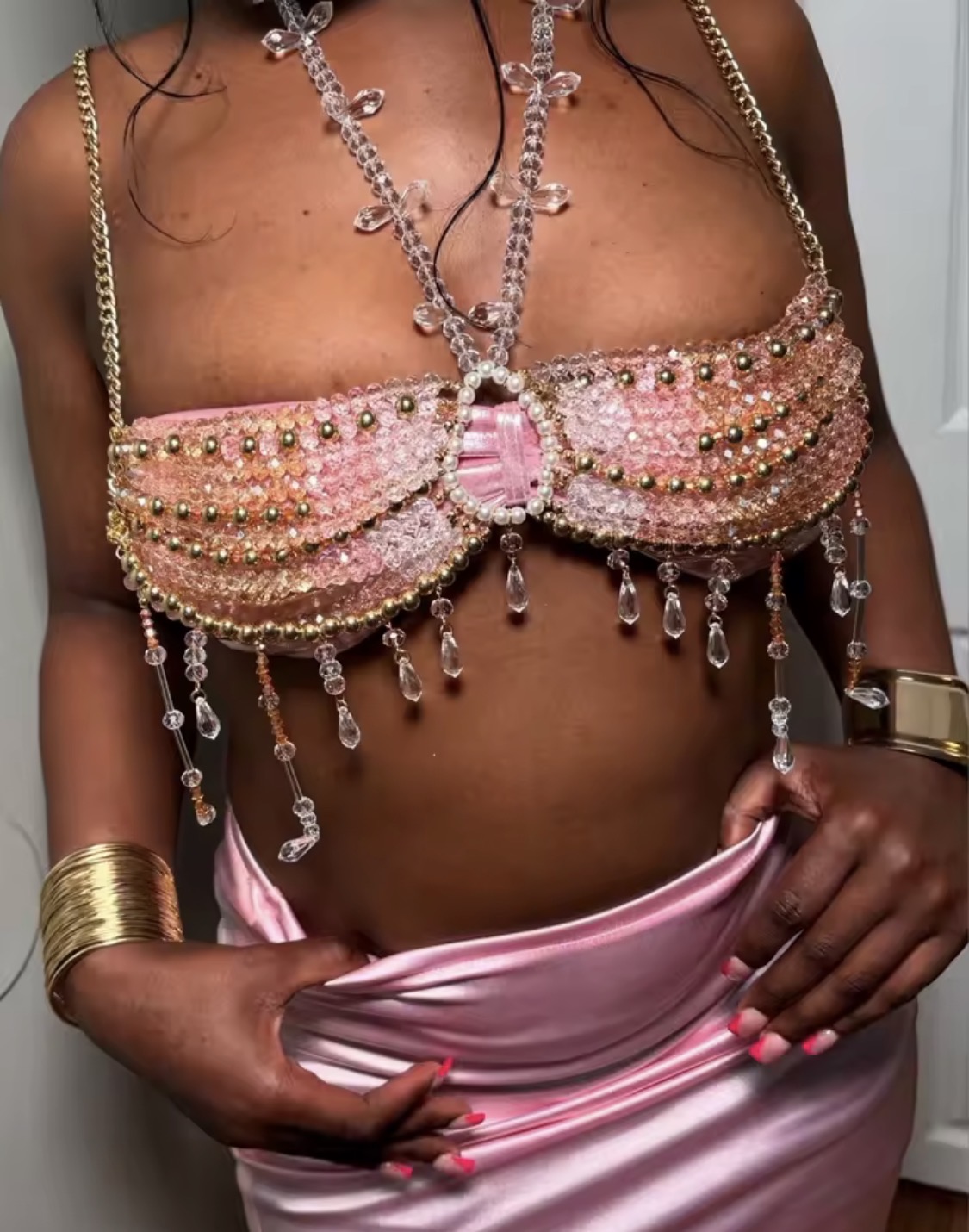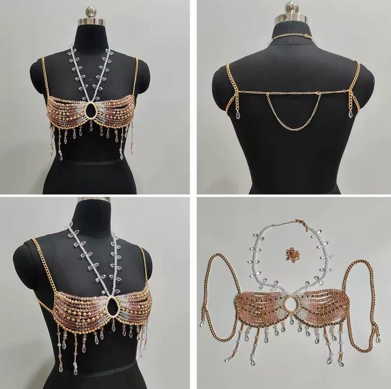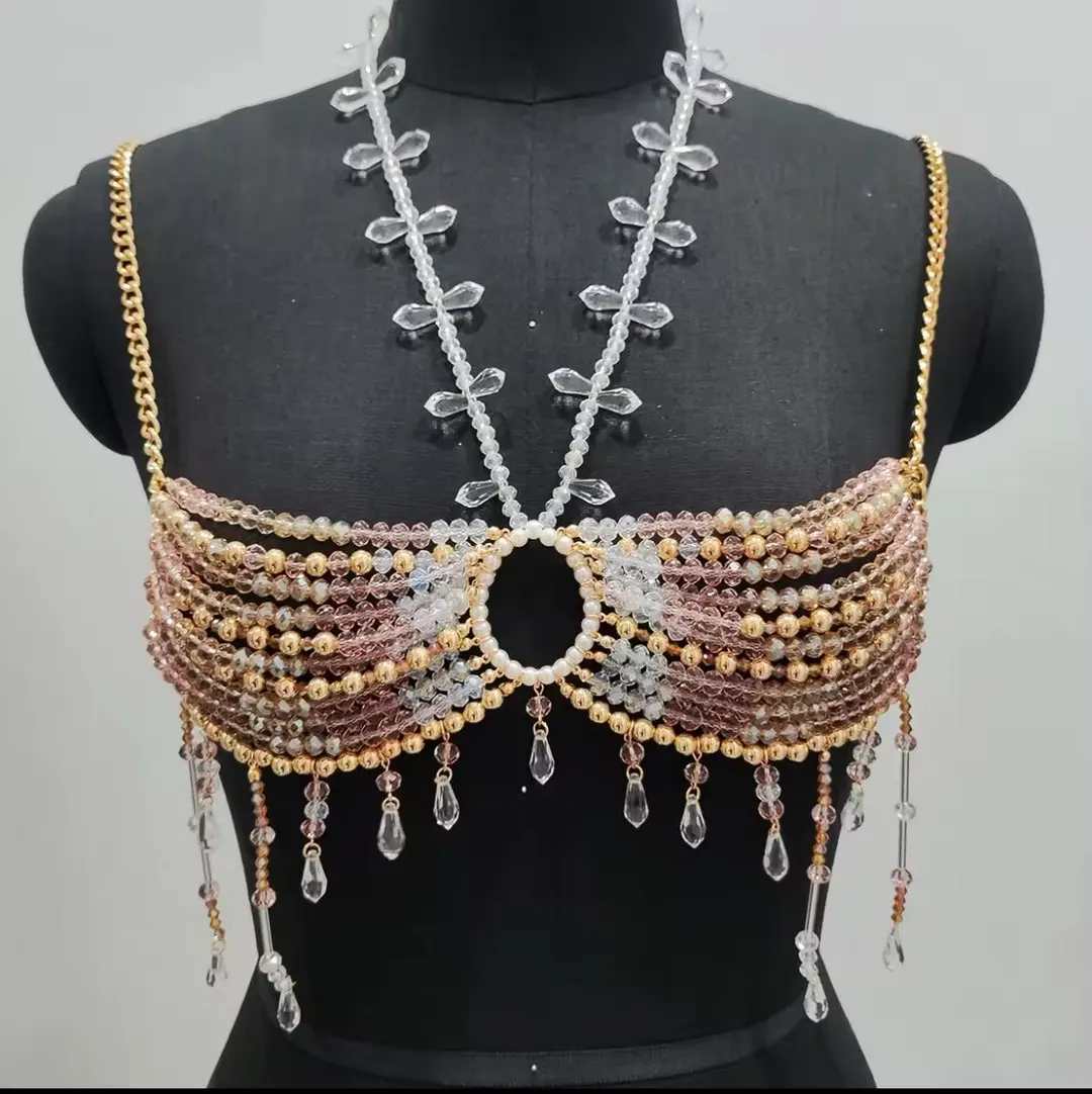 Women’s Handmade Crystal Champagne Body Chain Jewelry Beading Camisole Vest Bikini Bra Top