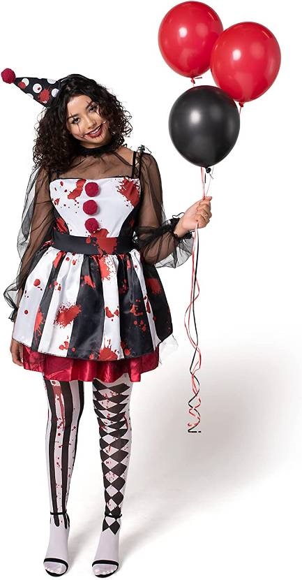 include one Pull-on dress, one clown hat, and a pair of stockings. Transforming you into a scary clown!