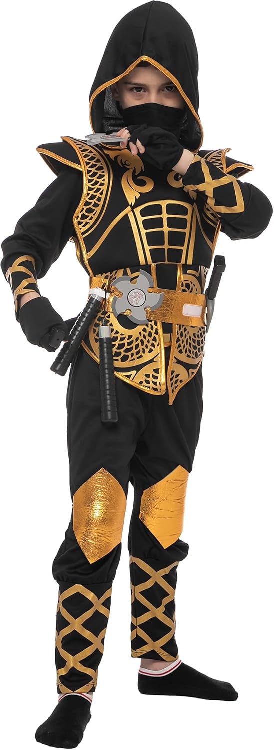Golden Ninja Costume for Boys includes 1 Ninja Jumpsuit with Attached Hood, 1 Face Mask, 1 Armour, 1 Belt, 1 Pair of Ninja Gloves, 2 Toy Foam Ninja Daggers and other foam accessories.