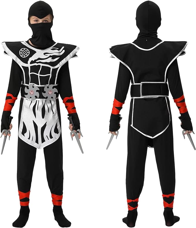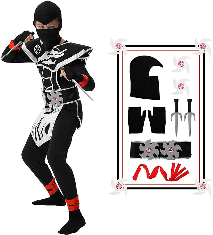 Kids Deluxe Ninja Costume Set includes 1* Ninja Costume, 9* ninja accessories, Super Value Pack for Role Play. Add Lots of Fun to Your Halloween Party. Silver Ninja Muscle costume for kids is made of high-quality 100% polyester. Ninja toys accessories are made of foam. Very comfortable to wear, kids will surely have fun wearing this set.