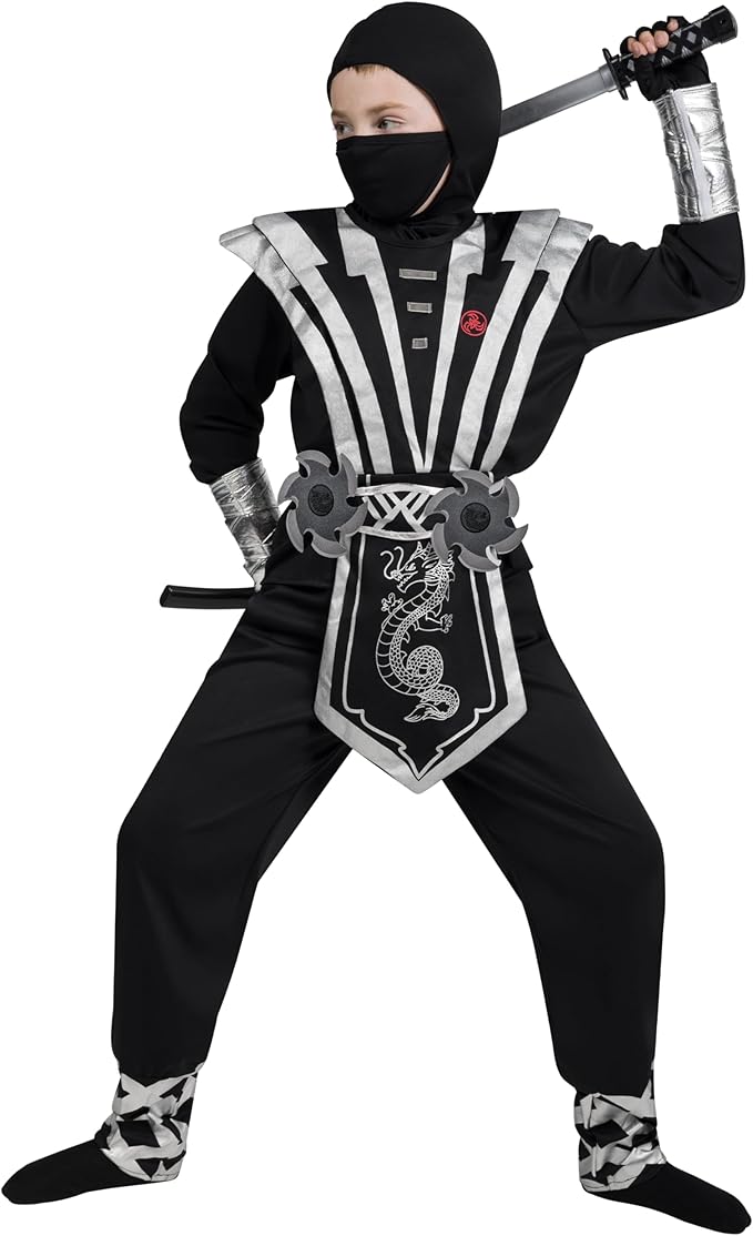 Ninja Costume includes a Mask, a Jumpsuit w/ Hood, 1 Armour, a Belt, 1 Pair of gloves, a pair of Ninja dagger, 1 Sword and Other Foam Accessories.