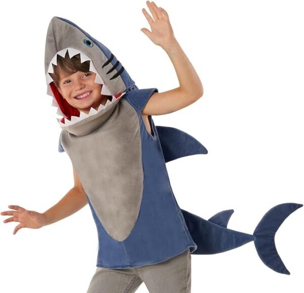 Includes: Sea blue, plush, shark tabard costume featuring a premium shark head with realistic eyes and teeth, as well as a playful shark tail for an adorable and fun dress-up experience.