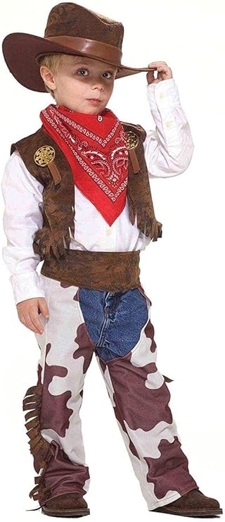 Cowboy hat, fringe vest, red bandana, and cow-print chaps create the perfect western-themed costume for kids and adults alike.