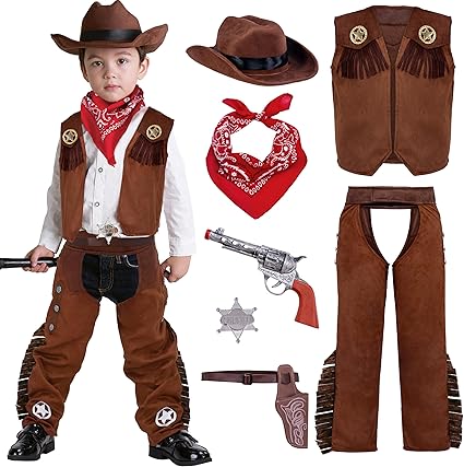 8 PCS Light Brown Costume includes 1 brown cowboy hat, 1 vest, 1 red bandana, 1 pair of pants,1 belt, 1 badge and other toy props, providing everything you need to create a complete cowboy look.