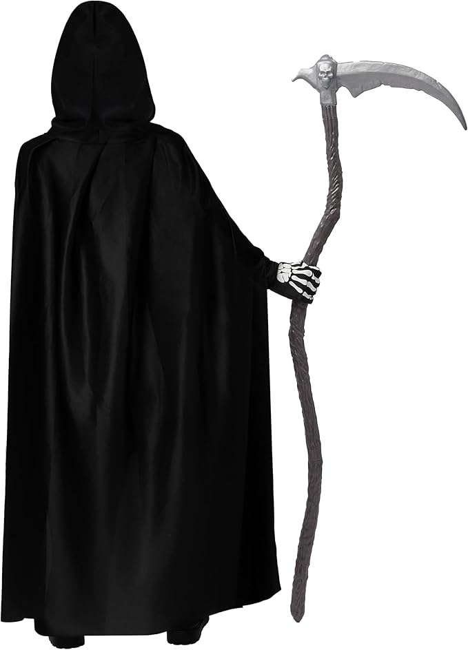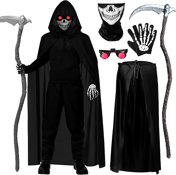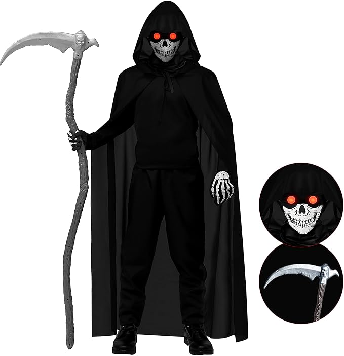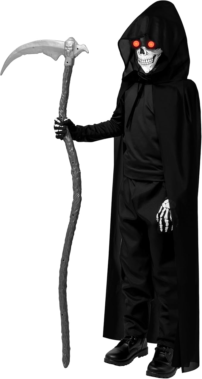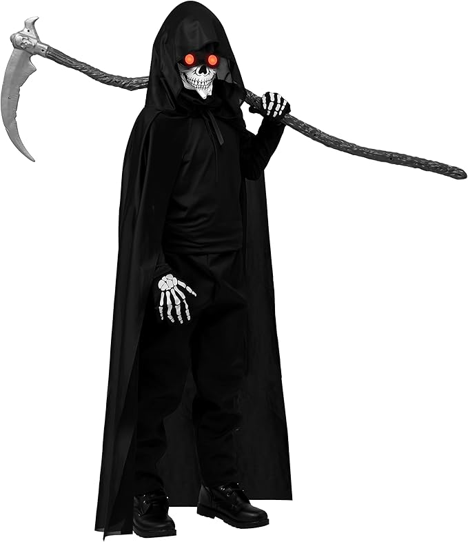 Set Includes: Boys Glowing Eyes Grim Reaper Costume set features everything your little one needs for a spooky adventure, including 1 hooded cloak, 1 mask, 1 Grim Reaper scythe, 1 pair of gloves, and 1 pair of Glowing Red glasses.