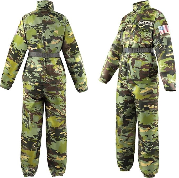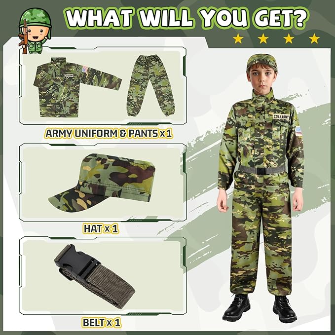 FUN SOLDIER ROLE-PLAYING COSTUME – This army costume for boys is suitable for various role-playing games. With this fun army costume set, kids can dress up as their favorite soldier heroes and have endless fun! They can fully immerse themselves when playing a role as soldiers on Halloween Day, career day, birthday parties, and other dress-up activities.