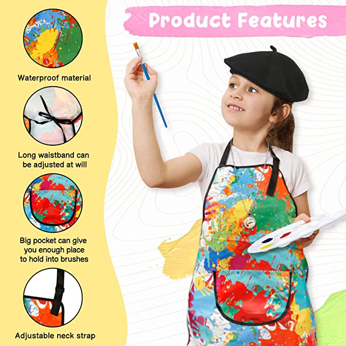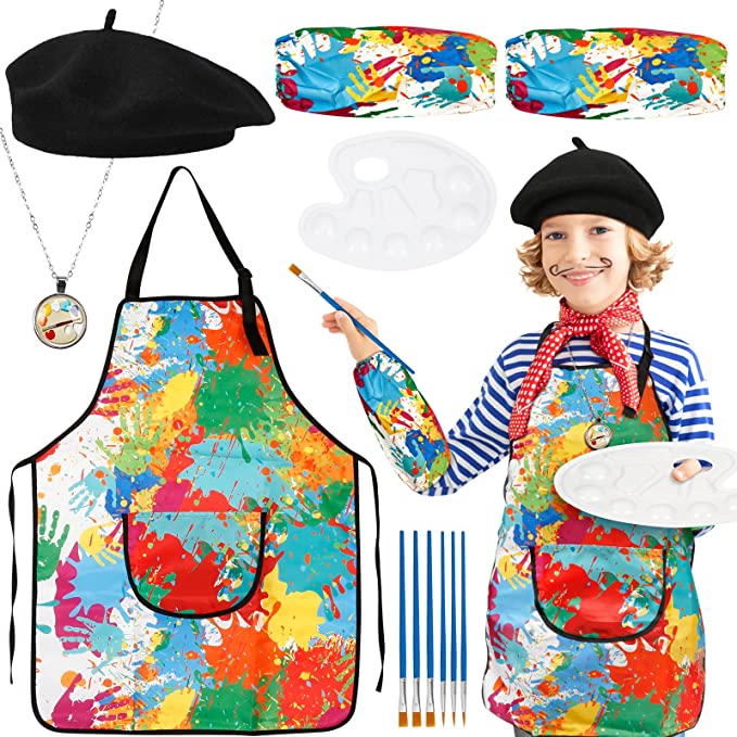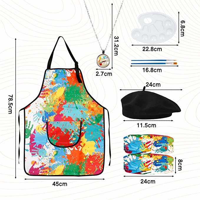 Artist Costume Accessories Set : Introducing the ultimate painting kit for kids – Set includes a kids black artist felt hat, a colorful footprint pattern apron for kids, a pair of sleeves, a white paint trays, 6 pcs brushes, and a sketchpad necklace. Rich accessories to help children who enjoy painting create better.