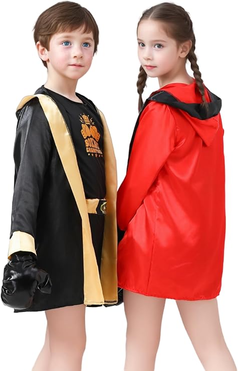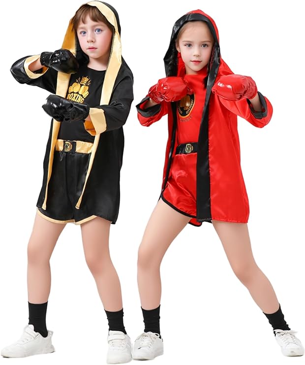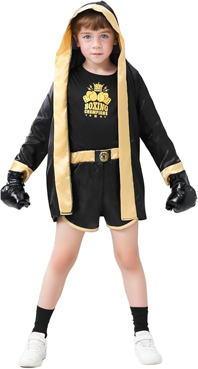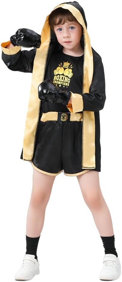 Includes: Short-sleeved top, shorts, hooded cape, and boxing gloves for an authentic boxer look.