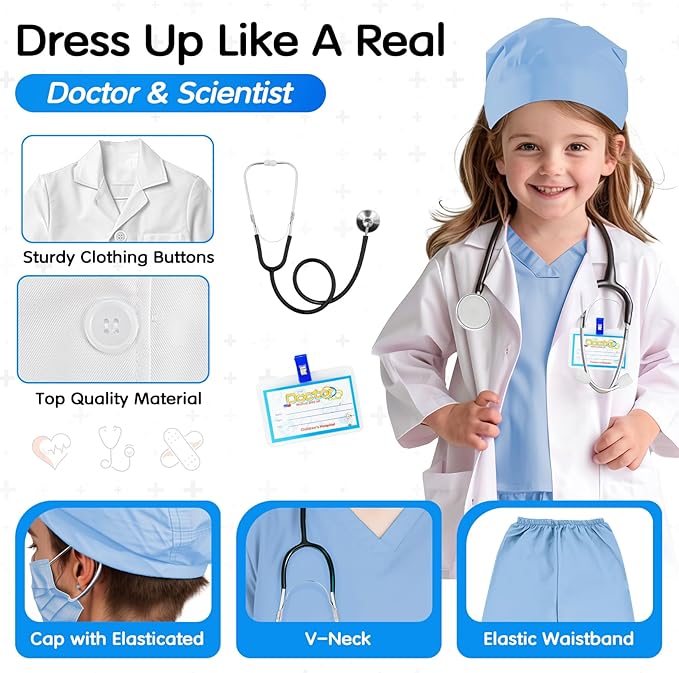 Complete Doctor Costume Set: This set includes V-neck and half sleeve top, cap, white doctor coat, pants, mask, stethoscope props, and an ID card to help kids play the part of a real doctor.