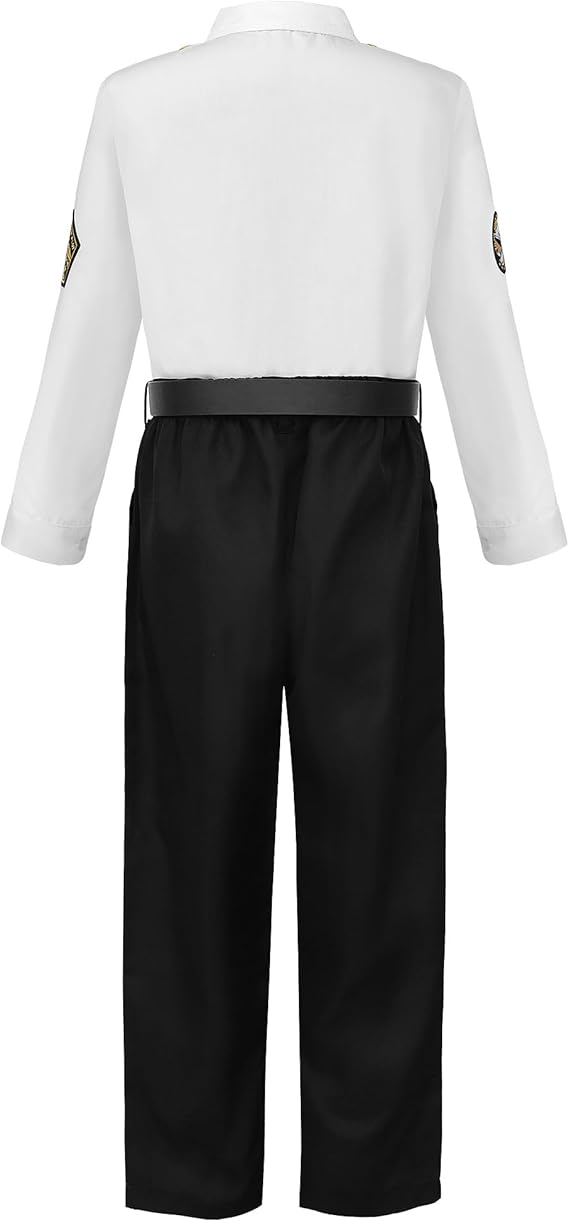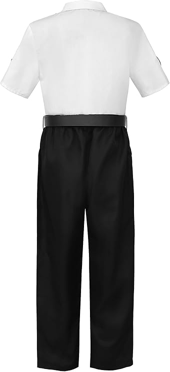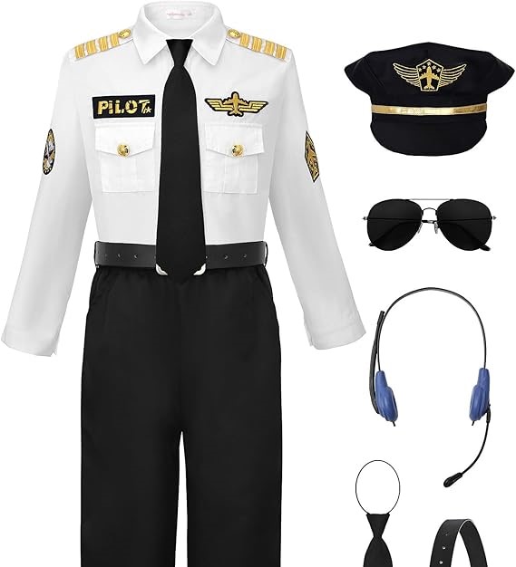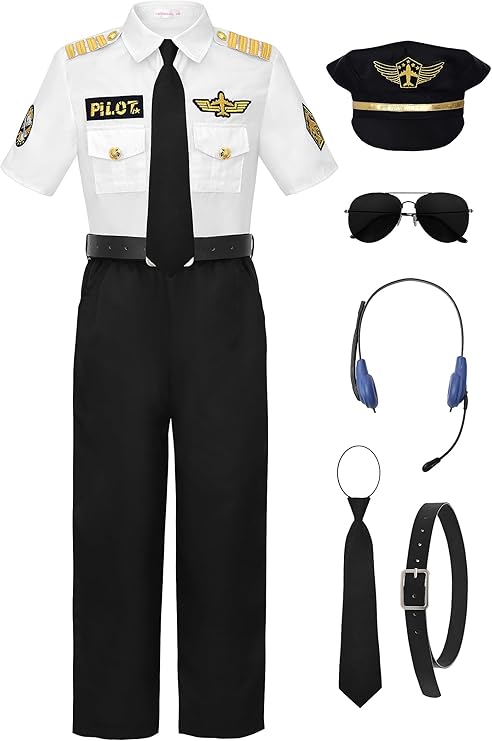 Kids Pilot Costume Set includes pilot uniform top and pants, hat, sunglasses, black leather belt, pilot headphones and black tie. With these accessories, your child will instantly become a cool pilot.