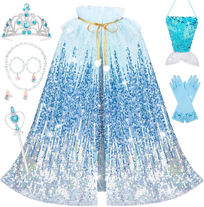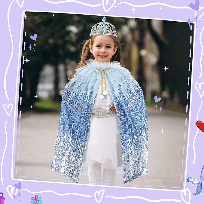 The Most Sparkling Blue-White Sequin Cape & Mermaid Toys Accessories as The Perfect Shine for Your Little Princess. Dazzling kids dress up cape design inspired by mermaid princess and girls’ favorite blue-white color combo. Pair it with the rich princess mermaid toys collection – princess crowns for little girls, necklace, bracelet, ring, wand, gloves and pink mermaid bag.