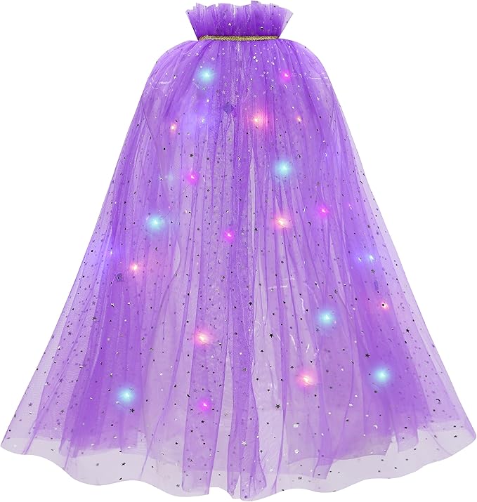 Sequins Capes for Girls : This princess dress up cape with a colorful glowing light strip on the back. With three dazzling light modes—constant light, fast flash, and slow flash. The girls’ favorite sparkling stars and moon were all over the long princess cloak, setting her off in the crowd shining like a real princess.