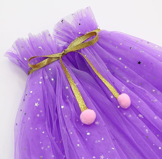 Girls Princess Cape: This princess dress up cape is made of soft and comfy mesh tulle fabric. The dress up cape contains two layers of sheer mesh, the neck of cape is designed with soft gold strap to prevent the shawl from falling off, no need to install it by yourself, just can wear it directly when you get it. Already sewn light strips for easier and safer use.