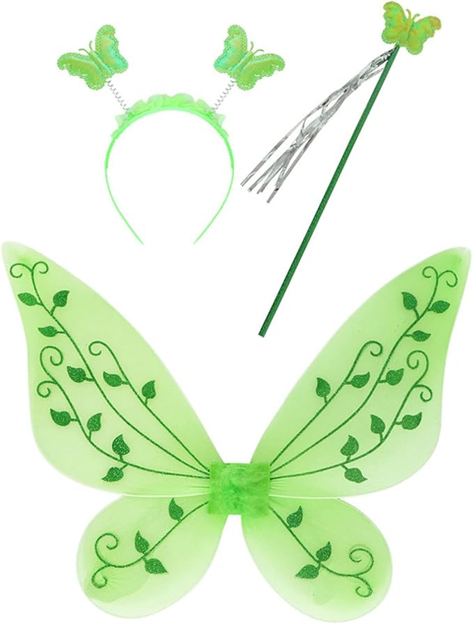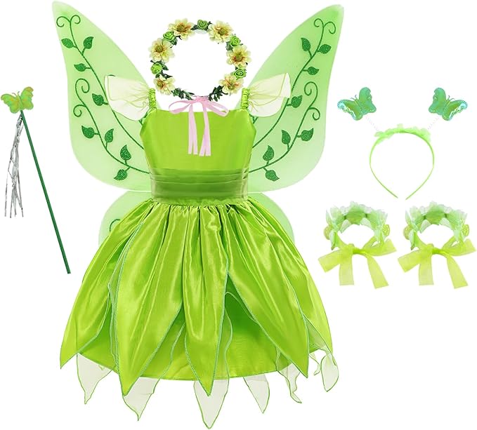 Package includes: Dress, wing set, garland headpiece and a pair of flower bracelets.