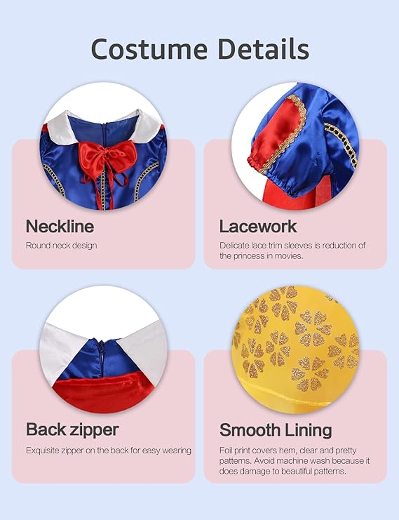 Material: Princess dress made from non-itchy and comfortable fabric, polyester and cotton skirt, its fabric is very soft and skin friendly.