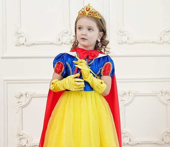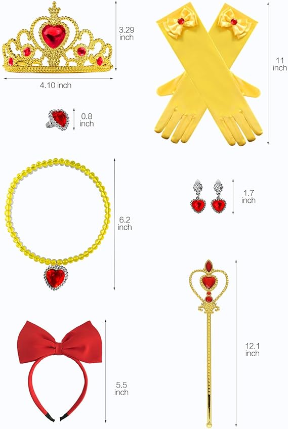 Princess Dress, Cape, Crown, Wand, Necklace, Earrings, Ring, and Gloves. These Rich accessories will be matching for your fancy-dress party.
