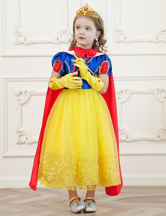 High quality materials with a detachable red cape, multi-layer yellow tulle skirt printed with exquisite flower pattern. Your girls will love this beautiful princess dress. The princess dress up accessories set, paired with a Luxurious artificial gem, and durable high quality elastics jewelry necklace designs, make your little girls become a unique princess.