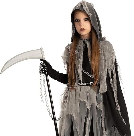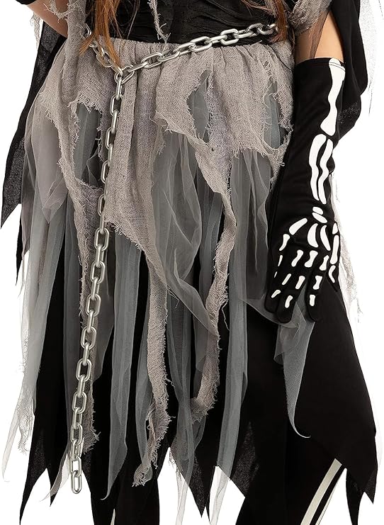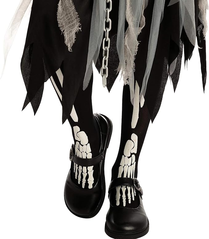 Halloween Grim Reaper Girls Halloween Costume Includes Dress, cape with hood, Glow in the dark printed glovelettes and tights, waist chain and Toy Scythe.