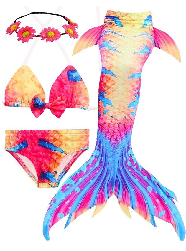 INCLUDES: ????Mermaid 4pcs swimsuit:1pc Top +1pc Underwear +1pc Mermaid Tail and Random color Sunflower Headband.