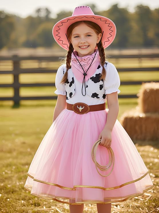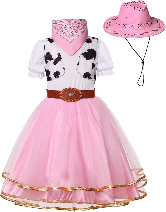 Cowgirl outfit included dress, bandana, waistcoats, and pink cowgirl hat.