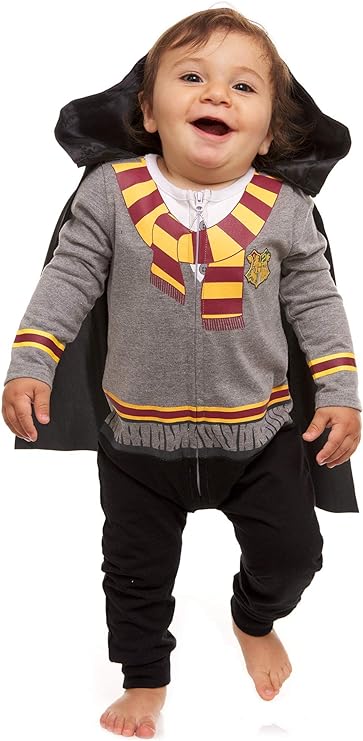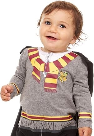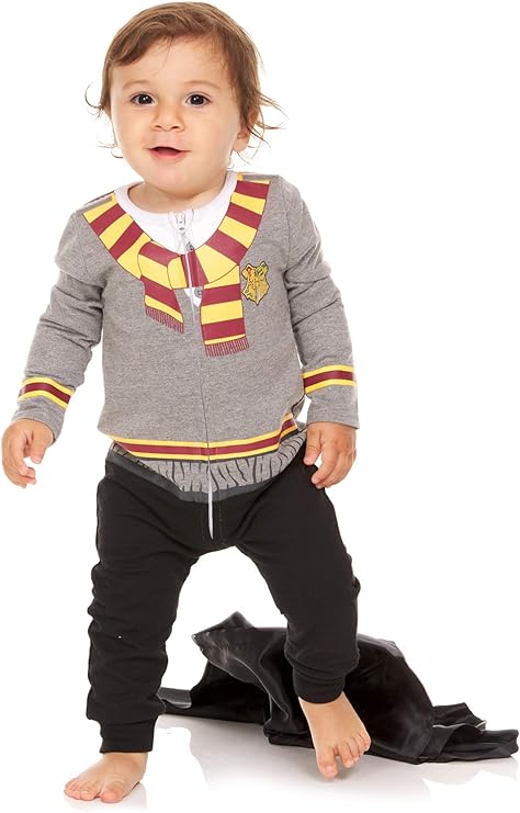 A baby boy costume outfit fit for Hogwarts and beyond, this long-sleeve baby bodysuit features a Hogwarts school uniform print with a Gryffindor scarf and trim. Now your baby can join the house of Harry Potter, Ron, and Hermione