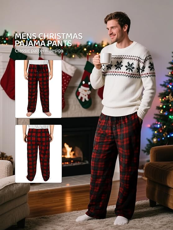 PRACTICAL MENS CHRISTMAS PAJAMAS: Pocket and button fly design of the men pajama bottoms meet the needs of practical storage and daily wear. Elastic bands and drawstrings offer personalization and a good fit