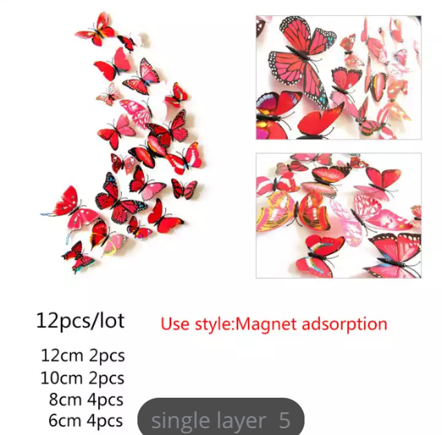 - Product size : one pack include double sided tape and 12pcs butterfly with attached magnet. Butterfly – (6cm*4pcs,8cm*4pcs,10cm*2pcs,12cm*2pcs)