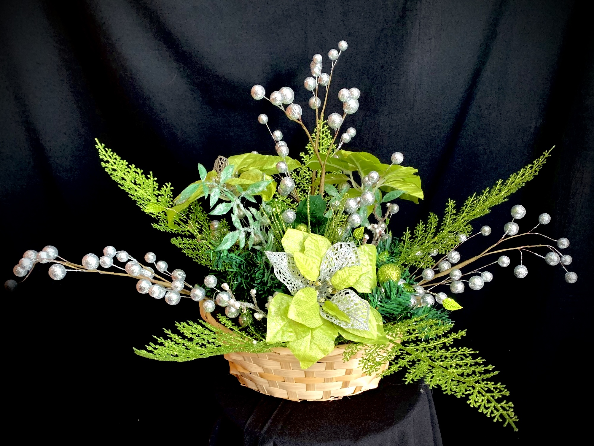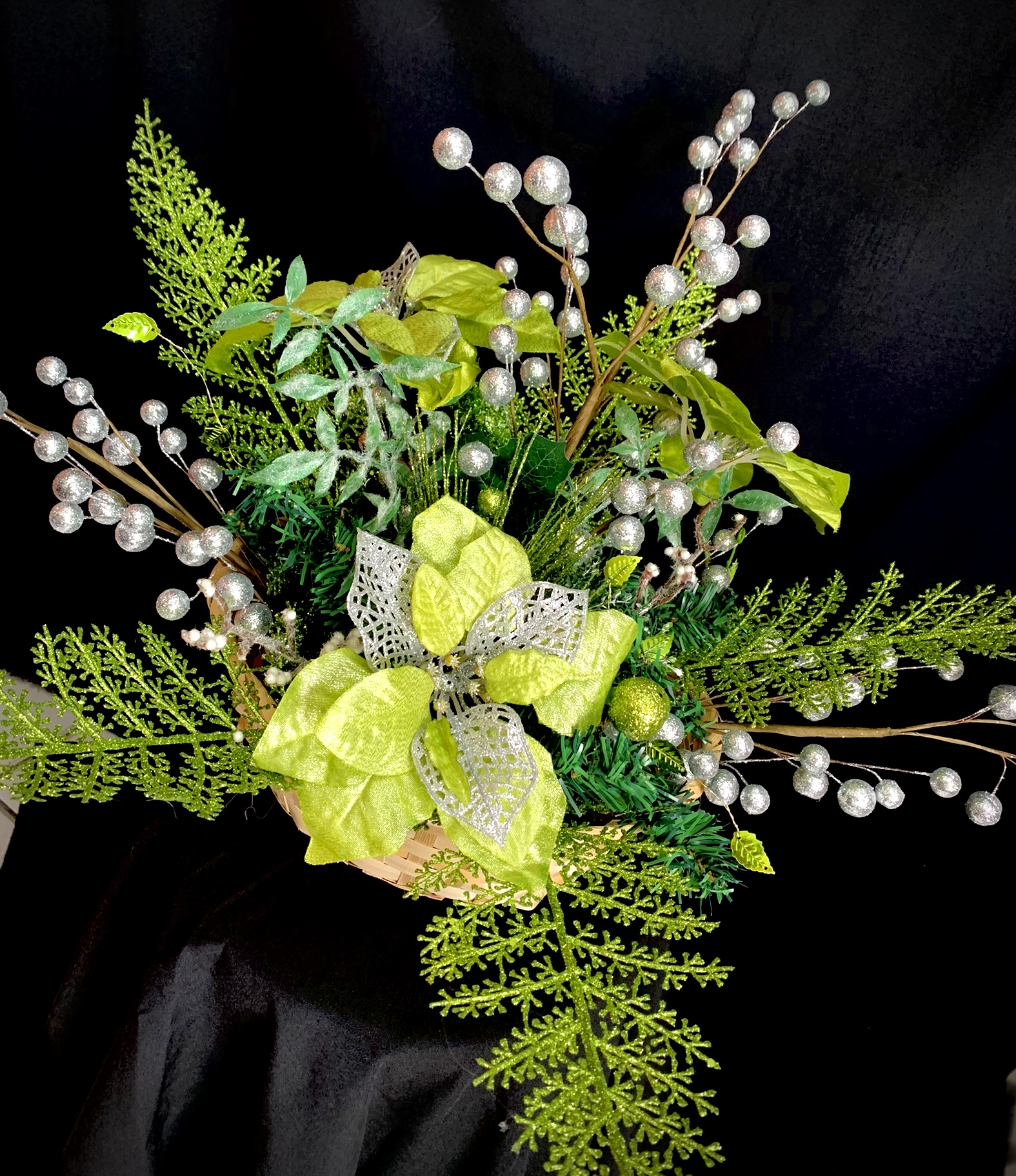 Christmas Decoration – Centerpiece – Sparkly, Green + Silver nature inspired, Christmas Poinsettia and Fern Basket arrangement