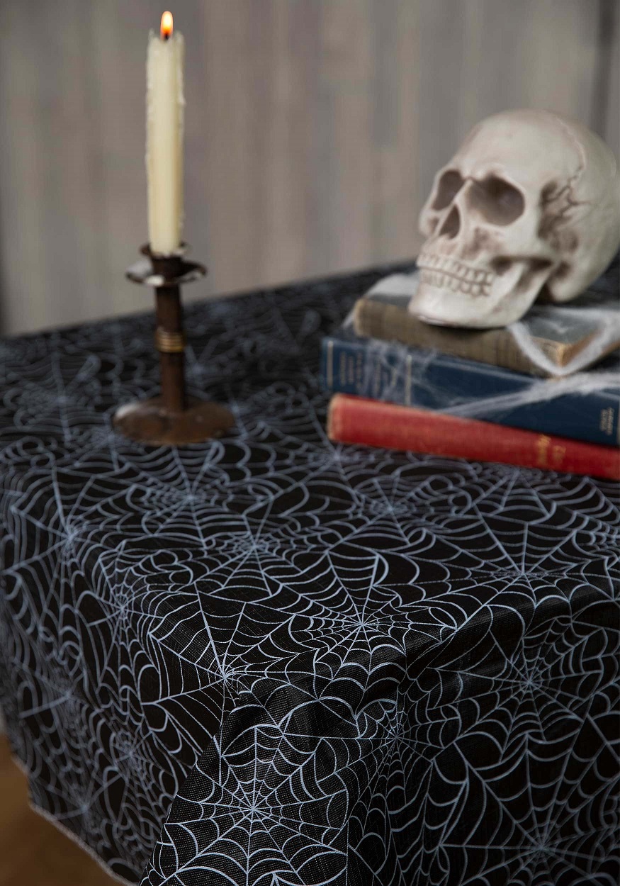 Black table cover features white spiderweb design