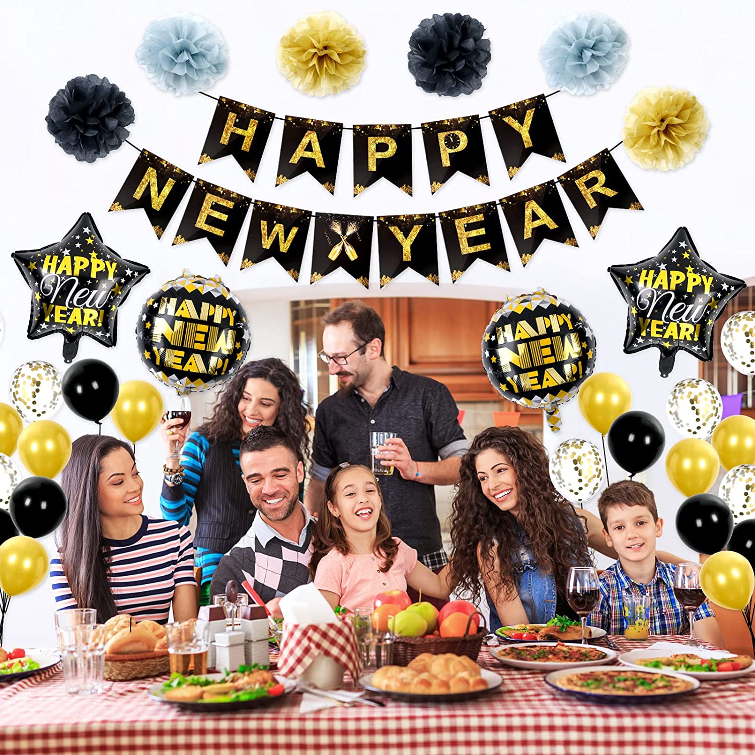 Black + Gold Happy New Year Banner Gold Black Paper Flag Bunting Swirl Streamers & Pom Poms Balloons for New year Party Decorations