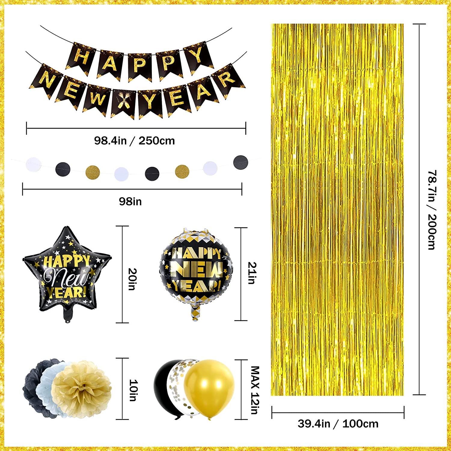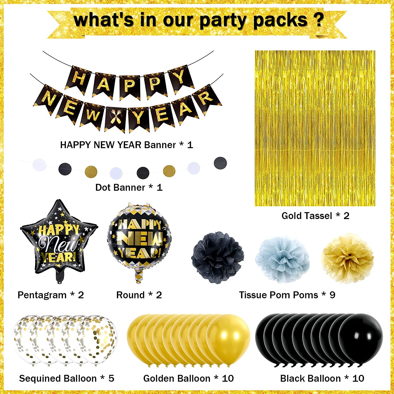 The New Year Eve Party Supplies include Happy New Year Banner*1, Black Balloons x 10, Gold Balloons x 10, Gold Confetti Balloons x 5, Pentagram Foil Balloons*2, Circle Foil Balloons*2, Black Pom Poms x 3, Gold Pom Poms x 3, Silver Pom Pom x 3, Gold Fringe Curtain x 2, Disc Charm*1.