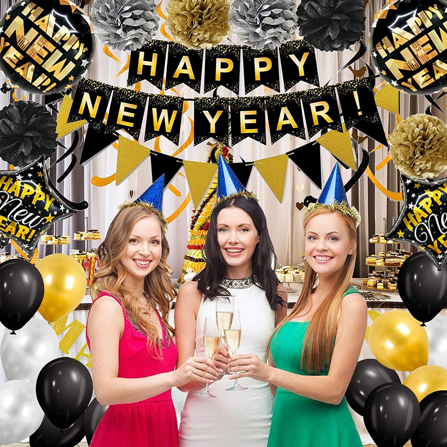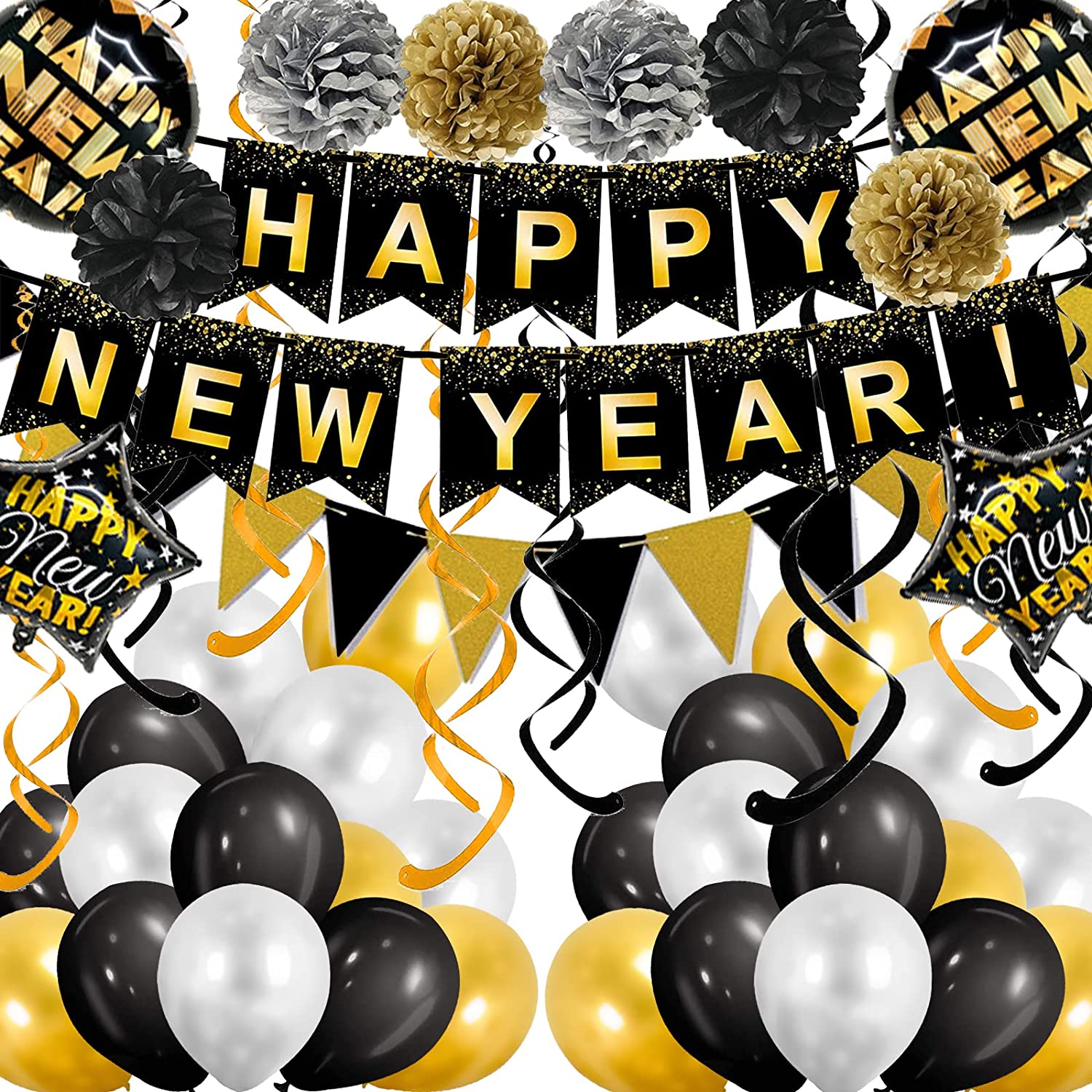Black Happy New Year Banner Gold Black Paper Flag Bunting Swirl Streamers & Pom Poms Balloons for New year Party Decorations Black Happy New Year Banner Gold Black Paper Flag Bunting Swirl Streamers & Pom Poms Balloons for New year Party Decorations Black Happy New Year Banner Gold Black Paper Flag Bunting Swirl Streamers & Pom Poms Balloons for New year Party Decorations