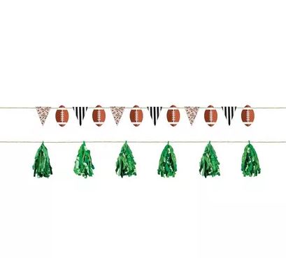 Deck out your game-day décor with a Ready Set Football Cardstock & Foil Banner Set. This 2-pack brings the football field to your party with its referee stripe pennants, football cutouts, and green tassels.